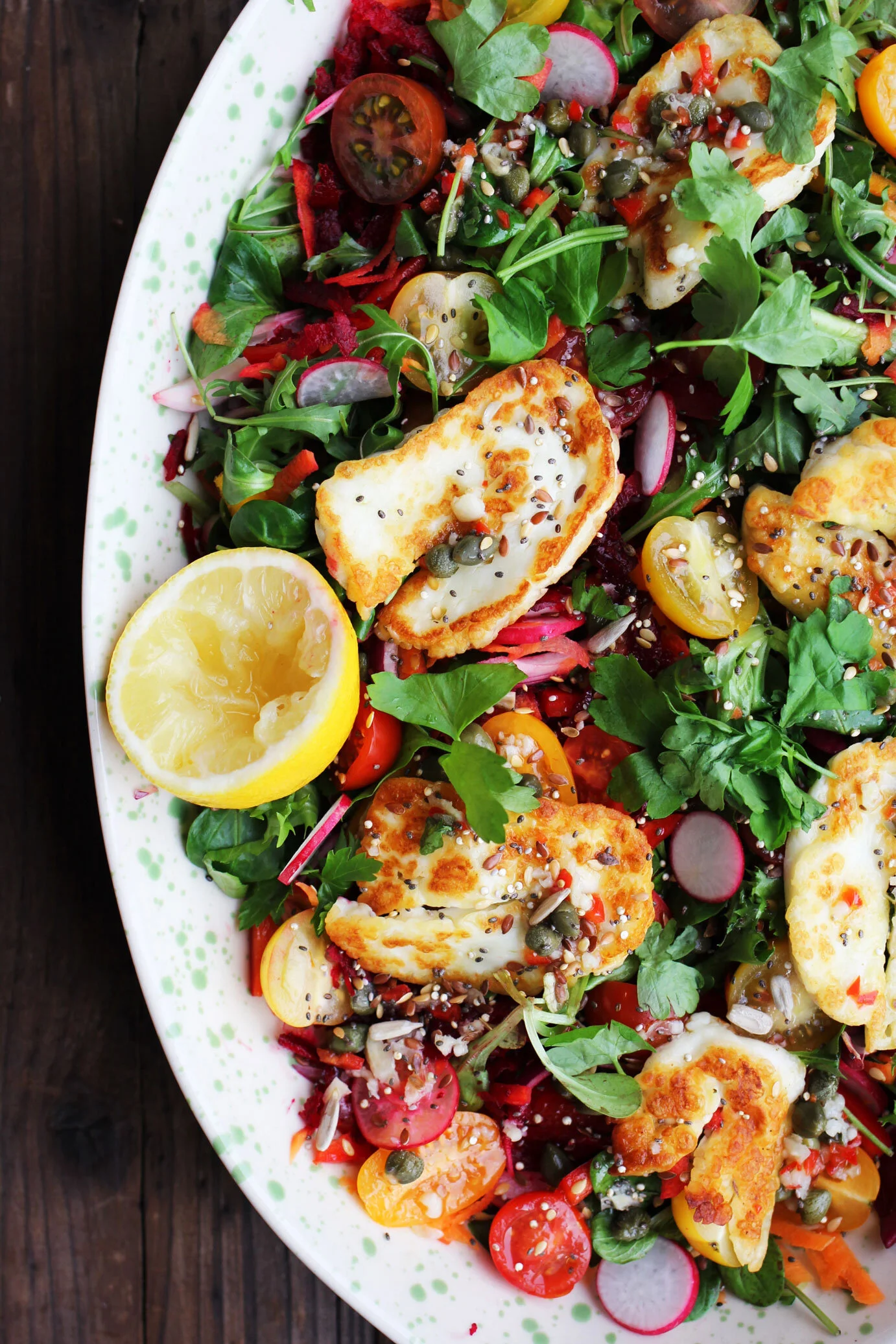 Now, let's talk about this delicious salad. Packed full of rainbow vegetables, in season beets and radish. Salty halloumi and topped with a lemon, caper, chilli and garlic dressing. Simply delicious and so bright that it makes me smile. I ran a poll and the majority of you voted to see a lot more vegetarian recipes, turns out a lot of you are vegetarian. So I am ploughing my efforts in to researching and creating some delicious meat free alternatives. If you are doing #veganuary or are a vegan, simply remove the halloumi and replace it with something else you enjoy or eat the salad without. It is very satisfying and packed full of nutrients. My Husband is currently eating it out of the serving dish with a serving spoon.